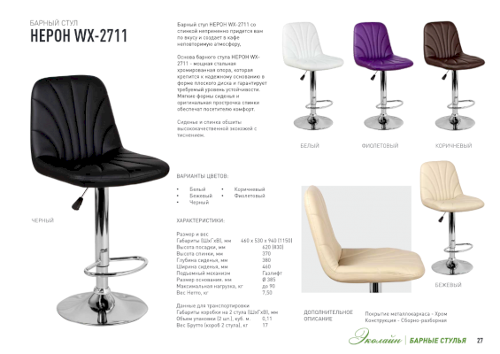 Барный стул НЕРОН WX-2711 со спинкой непременно придется вам по вкусу и создает в кафе неповторимую атмосферу. Основа барного стула НЕРОН WX-2711 - мощная стальная хромированная опора, которая крепится к надежному основанию в форме плоского диска и гарантирует требуемый уровень устойчивости.