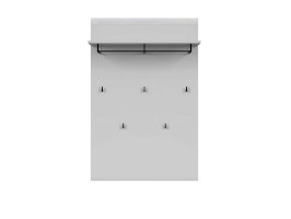 Вешалка представляет собой вертикальный щит, на который крепятся полка, металлическая составная вешалка и металлические крючки. На верхней части вешалки крепится планка декоративная из МДФ в цвете "Белый блеск". Вешалка  крепится на стену при помощи кронштейнов. Максимальная нагрузка на вешалку до 5 кг На полке вы сможете разместить головные уборы, шарфы и т.д.