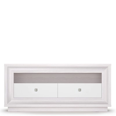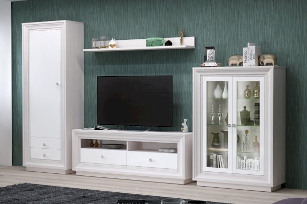 В модульной коллекции «Прато» в стиле Ар-деко вы найдёте широкий выбор ТВ-тумб, различных по габаритам и конструкции. Данная модель имеет ширину 1364 мм, благодаря чему с легкостью поместит телевизор с большой диагональю, при этом не большая глубина 426 мм позволит не загромождать пространство. К данной тумбе идеально подойдёт навесная полка с такой же шириной.