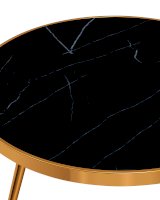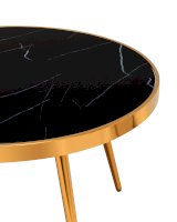 Столешница выполнена из закаленного стекла, которое обладает повышенной прочностью и стойкостью к перепадам температур, способно выдерживать большие нагрузки. Поверхность столешницы декорирована рисунком черного мрамора, который идеально сочетается со стальными ножками в золотом цвете.
