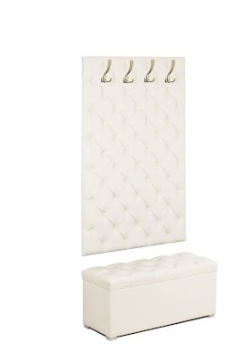 Элегантная серия мебели для прихожей  Мишель не оставит никого равнодушным. Мягкая стеновая панель  с каретной стяжкой Мишель  наполнит  уютом вашу прихожую, а пуф Мишель дополнит  интерьер и будет очень функциональным, сиденье пуфа открывается, под сиденьем расположена удобная ниша. Стеновая панель выполнена в классической каретной стяжке и имеет 2 размера ширины 75 см и 95 см, к данным стеновым панелям предлагается пуф, также  шириной 75 и 95 см. Можно приобрести как полный комплект так и каждый элемент отдельно.
