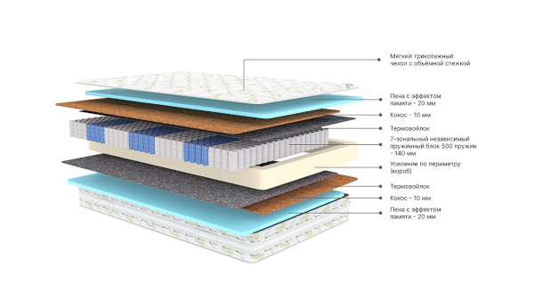 Наполнитель: ППУ, независимый пружинный блок, термовойлок, кокос, пена с эффектом памяти