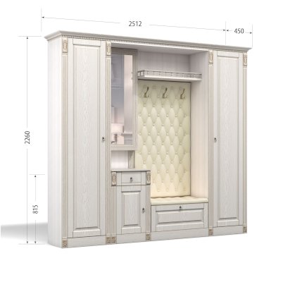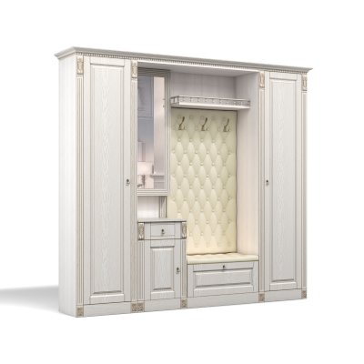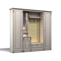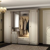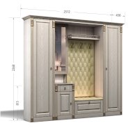 Прихожая выполнена в классическом стиле с декоративными элементами. Фасады и декоративные элементы патинированы, патина наносится вручную, по классической итальянской технологии и защищена матовым лаком. Мягкие элементы (вешалка и сиденье) выполнены из экокожи, декорированы каретной стяжкой.