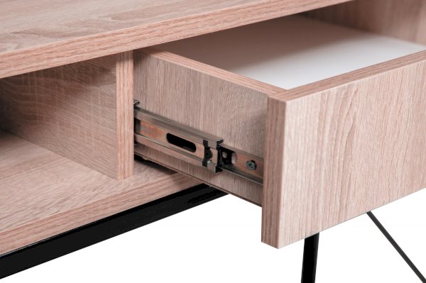Опоры и декоративные элементы сделаны из металла. Столешница выполнена из ЛДСП. Геометрические элементы по бокам придают строгому письменному столу стиль и красоту. Плюс к этому они еще и функциональны – через них легко можно пропустить любой провод, что невозможно при сплошных боковых панелях. Металлическая основа имеет специальное укрепление, которое позволяет выдержать нагрузку до 80 кг. Таким образом, стол без труда выдержит всю технику, необходимую для учебы и для работы. Габариты столешницы позволяют разместить на своей площади большой монитор, принтер и оставить место для работы с бумагами и учебниками. Выдвижной ящик снабжен шариковыми направляющими, что обеспечивает плавное и бесшумное выдвижение. Справа и слева от выдвижного ящика есть две удобные ниши, в которые можно убрать то, что не предназначено для всеобщего обозрения.