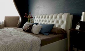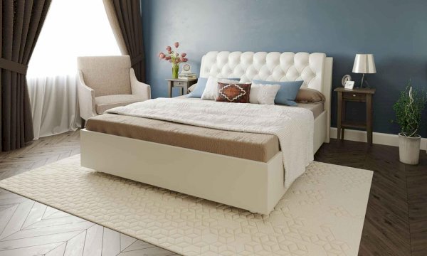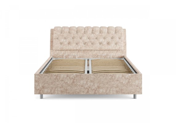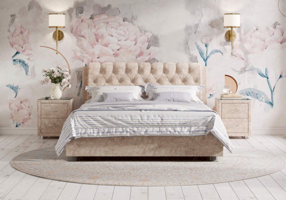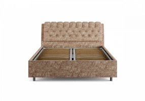 Элегантная интерьерная кровать с изголовьем, украшенным декоративными пуговицами и глубокой пиковкой. Модель изготовлена из ДСП. В комплект кровати входит кроватное основание. Каркас основания выполнен из металла, ламели - из берёзы. При необходимости в комплект можно включить подъемный механизм с бельевым ящиком. Обратная сторона изголовья обита темно-серым спандбондом, но, при желании, её можно выполнить из основного обивочного материала.