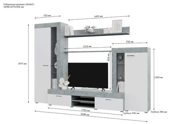 Размер ниши под ТВ (ШхВ): 1208х785 мм