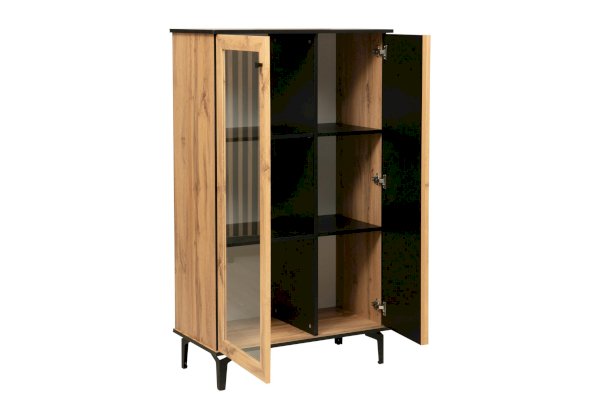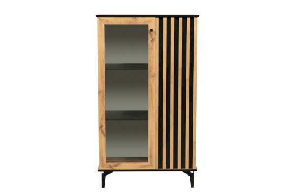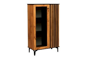 Шкаф визуально разделен на две части. В самом шкафу все просто – левое пространство за стеклом, правое – закрытое. Внутри – по три полки из ЛДСП. Каждая выдерживает вес до 5 кг. Стеклянная дверца обрамлена рамкой в цвет дерева, закрытая – с визитной карточкой коллекции –   с реечным фасадом. Они разной ширины, так как левая часть, по традиции коллекции, шире, а правая – уже. За стеклом отлично смотрится посуда и сувениры, за закрытой дверцей – книги.