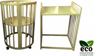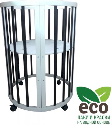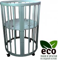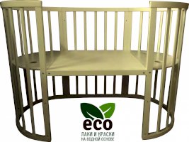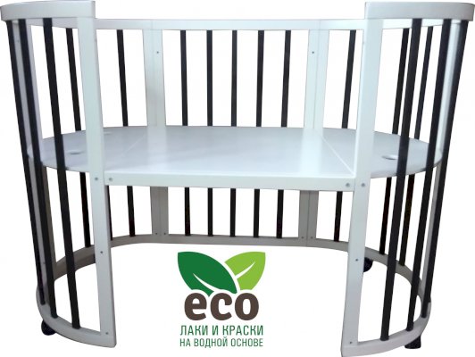 Выполнена из отборной бессучковой древесины березы без стыков, склеек и из высокопрочного МДФ. Привлекательный внешний вид достигается за счёт использования технологии скрытия стыков и метода тройной шлифовки. Покрыта нетоксичными лаками и красками на водной основе. В комплекте имеется 4 колёса с возможностью установки в различных положениях (для круглой и овальной кроватки).