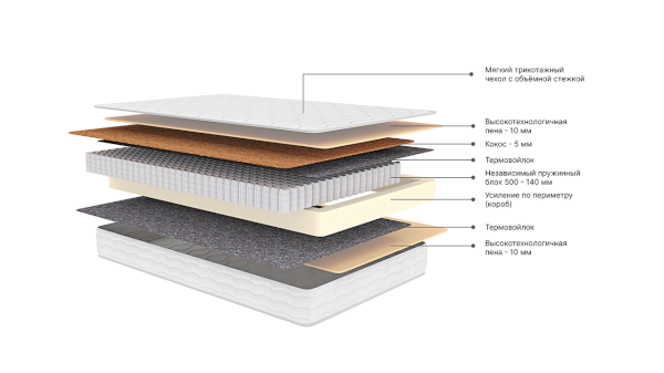 Наполнитель: ППУ, независимый пружинный блок, термовойлок, кокос, высокоэластичная пена