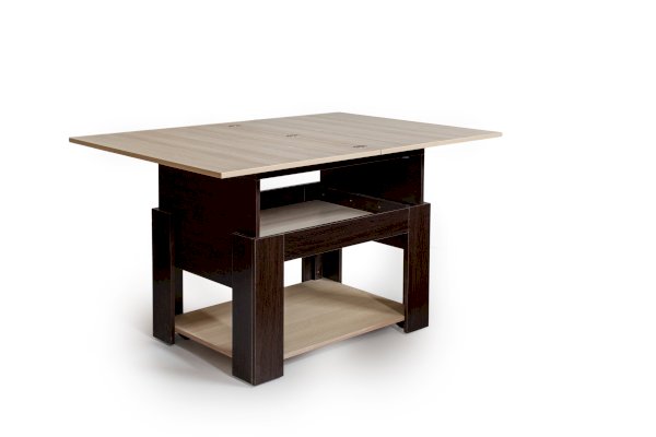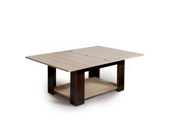 Журнальный столик СЖT-1 имеет два варианта раскладывания. Можно только увеличить площадь поверхности стола-трансформера за счет поворотно-раскладной столешницы, а можно с помощью дополнительного механизма подъема увеличить и высоту стола. Благодаря простому механизму трансформации журнальный стол идеально сочетает в себе такие качества как надежность и функциональность.